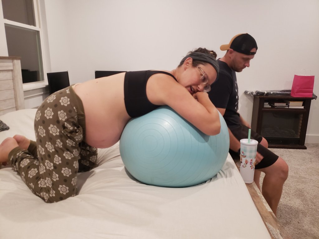 Laboring at home and not having to worry about packing up and getting in the car was so nice. I was completely comfortable just walking around our house. Robert was definitely my rock, and always has been. He’s the best husband a woman could ever ask for! He squeezed my hips and rubbed my back, I’m pretty sure I broke his hand when I was squeezing it. I sat on our bed with my exercise ball, I lay on the floor, I did inversions on the couch for a couple of contractions to get her into a better position because I was having some pretty intense back labor.